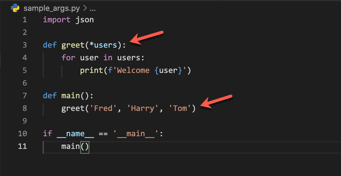 The *args will give you all function parameters as a tuple: 06/02/2018 · in python function, an argument with single asterisk (star) prefixed to it helps in receiving variable number of argument from calling environment. 30/08/2008 · the *args and **kwargs is a common idiom to allow arbitrary number of arguments to functions as described in the section more on defining functions in the python documentation. An argument is the … Return val1 + val2 + val3.