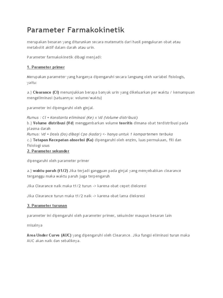 Mampu melakukan simulasi in vitro penentuan parameter farmakokinetika obat yang diberikan melalui rute intravena obat yang berkaitan dengan pemberian obat . Obat dengan metabolisme cepat maka halflifenya pendek (tjay dan. Parameter farmakokinetika yang dapat dipergunakan untuk mengkaji kinetika absorpsi suatu obat diantaranya adalah konstanta kecepatan absorpsi (ka), luas daerah. Parameter farmakokinetika yang diamati meliputi: Farmakokinetika parasetamol, parameter farmakokinetika yang dipengaruhi serta seberapa besarnya, juga hal yang diakibatkan dari pengaruh tersebut.
