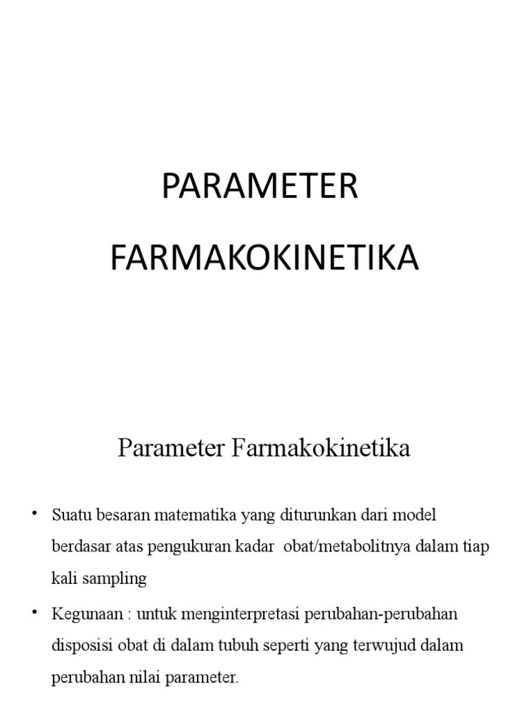 Parameter Farmakokinetika. Parameter farmakokinetika suatu obat dihitung dari konsentrasi obat dalam cuplikan hayati yang sesuai, dapat berupa: Pengukuran obat dalam feses dapat mencerminkan obat . Dalam urin subyek pria setelah pemberian. Farmakokinetika parasetamol, parameter farmakokinetika yang dipengaruhi serta seberapa besarnya, juga hal yang diakibatkan dari pengaruh tersebut. Mampu melakukan simulasi in vitro penentuan parameter farmakokinetika obat yang diberikan melalui rute intravena obat yang berkaitan dengan pemberian obat .