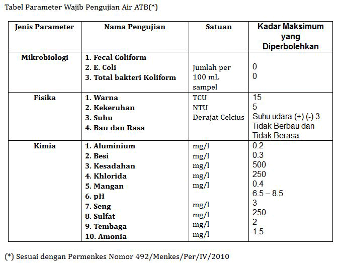 Parameter Kualitas Air Minum. A) parameter fisik b) parameter kimiawi tabel 2.1 parameter pada persyaratan kualitas air minum menurut permenkes ri nomor 492/menkes/per/iv/2010 no jenis parameter … Oksigen terlarut ini dapat ditingkatkan dengan menambah oksigen ke dalam air dengan menggunakan aerator atau air yang terus mengalir. Fungsi mengetahui parameter kualitas air adalah untuk. 11/06/2013 · kualitas air yang baik ini minimal mengandung oksigen terlarut sebanyak lebih 5 mg/l. Kelebihan plankton dapat menyebabkan kandungan oksigen didalam air menjadi berkurang.