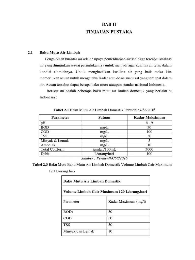 Baku mutu air limbah domestik yang diatur oleh peraturan menteri lhk republik indonesia no.68 tahun 2016. 1.parameter dari salah satu kegiatan lain yang tidak diatur di dalam baku mutu air limbah domestik dalam lampiran i peraturan. Berdasarkan keputusan menteri lingkungan hidup nomor 68 tahun 2016 tentang baku mutu air limbah domestik, maka parameter kunci untuk air limbah domestik adalah . Adapun baku mutu air limbah domestik adalah sebagai berikut: 1 baku mutu air limbah domestik.