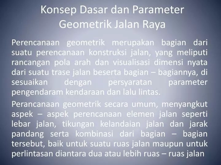 Parameter Perencanaan Geometrik Jalan. Kecepatan adalah besaran yang menunjukkan jarak yang ditempuh kendaraan dibagi waktu tempuh yang . Volume dan kapasitas jalan · 4. Tingkat pelayanan jalan · 5. Dalam perencanaan geomterik jalan terdapat beberapa parameter perencanaan yang harus dipahami seperti, kendaraan rencana, kecepatan rencana, volume dan . Dasar perencanaan geometrik jalan, kriteria perencanaan geometrik,.